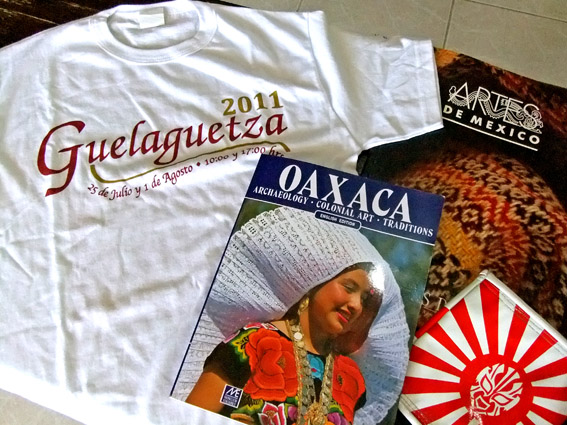 会場でもらったGuelaguetza Tシャツ、その祭りに感動しすぎて買った関連書籍、あとルチャリブレ見に行った時にラッキーでもらった、レスラーのサポーター。Mr. Cacaoさんありがとうございます。