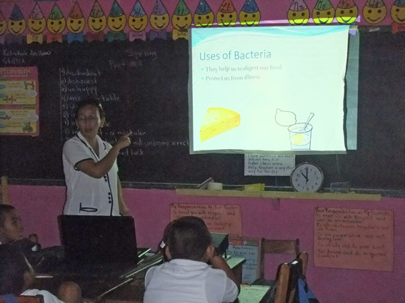 パワーポイントを用いて素晴らしくわかりやすい授業を行う先生の図。